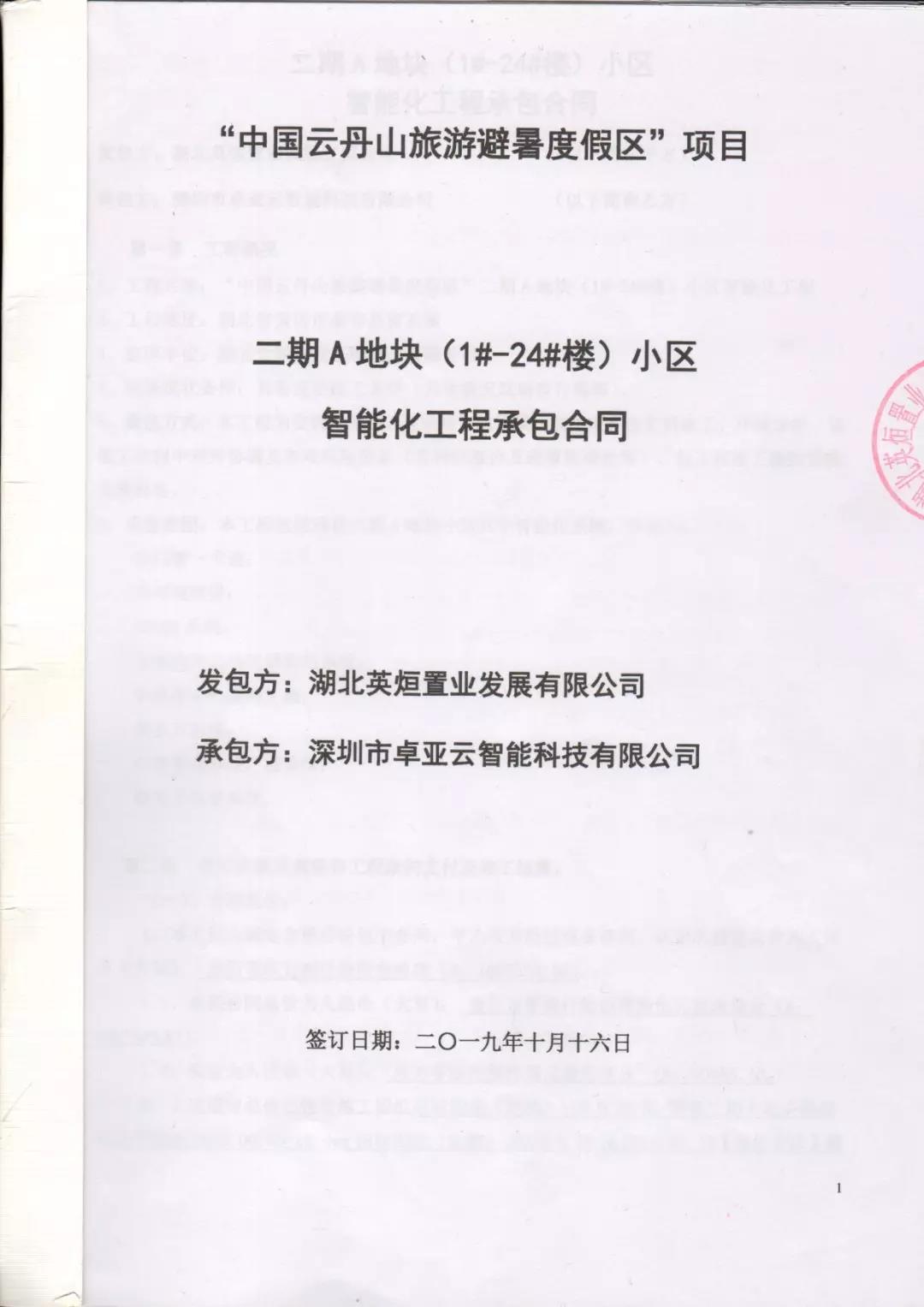 2019年10月16日,深圳市卓亞云智能科技有限公司與湖北大漢隆城投資開發(fā)集團旗下湖北英烜置業(yè)發(fā)展有限公司簽訂《智能化工程承包合同》,根據(jù)協(xié)議,雙方將共同開展大數(shù)據(jù)、云計算、物聯(lián)網(wǎng)、人工智能在智能家居,智慧酒店,智慧社區(qū),智慧度假區(qū)業(yè)務場景的深度合作,共同推動中國云丹山旅游度假區(qū)的智能家居,智慧酒店,智慧社區(qū),智慧度假區(qū)相關(guān)業(yè)務的落地。