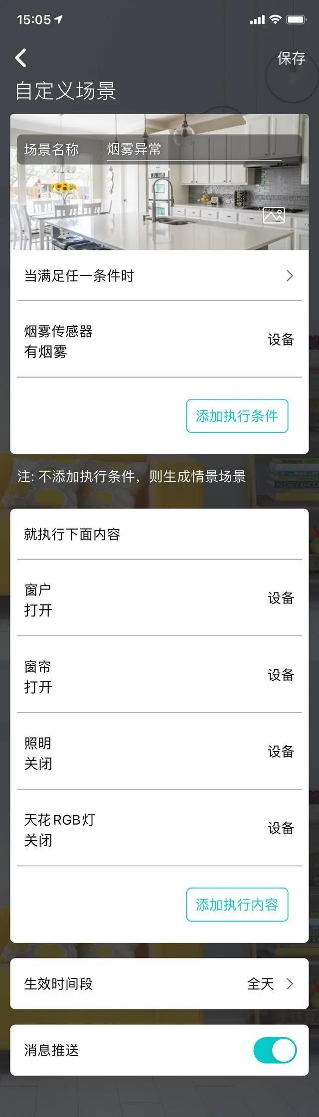 煙霧傳感器可以在感應(yīng)異常煙霧出現(xiàn)時(shí),聯(lián)動(dòng)讓關(guān)聯(lián)區(qū)域內(nèi)的電器斷電;用戶在收到報(bào)警推送后可以及時(shí)求助,處理緊急情況。
